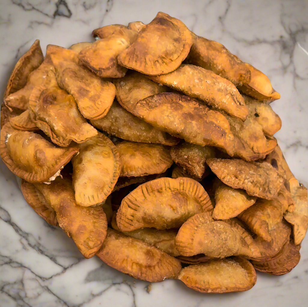 A handcrafted assortment of 25 golden, flaky empanadas filled with seasoned ground beef, melted cheese, and a rich tomato sauce.