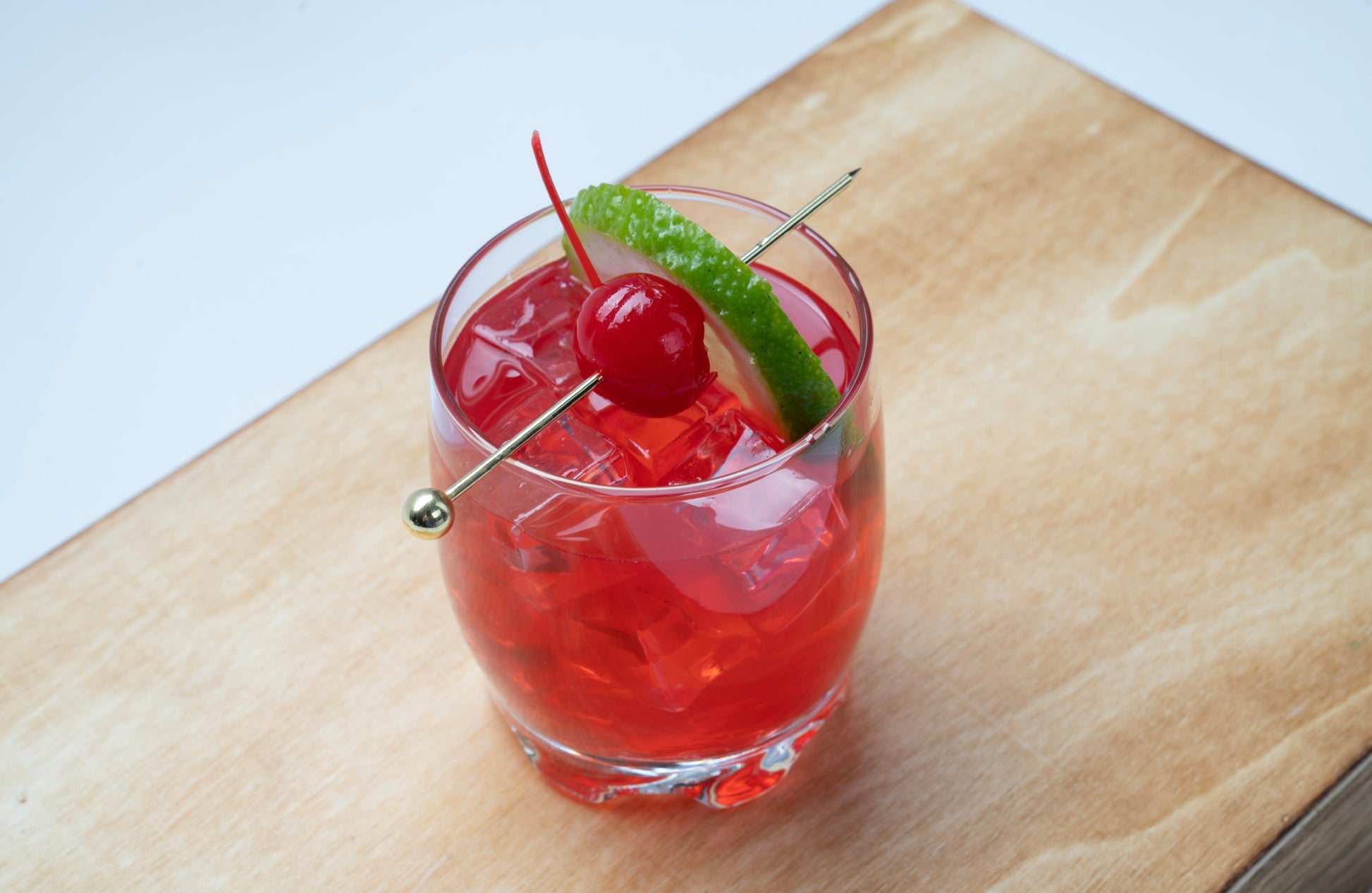 Cocktail is served with a cherry and lime garnish.