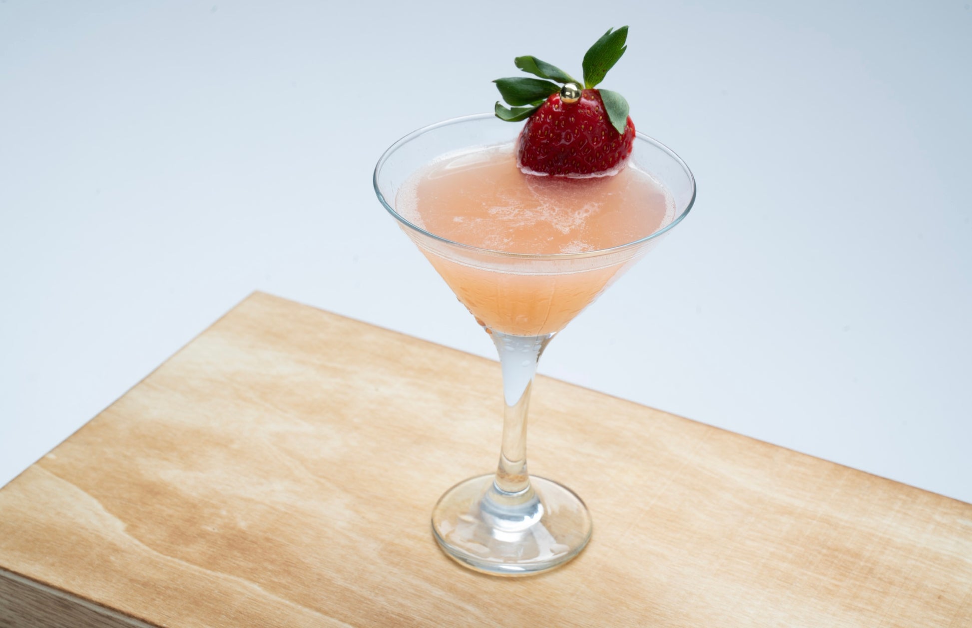 Cocktail is served with a strawberry garnish.